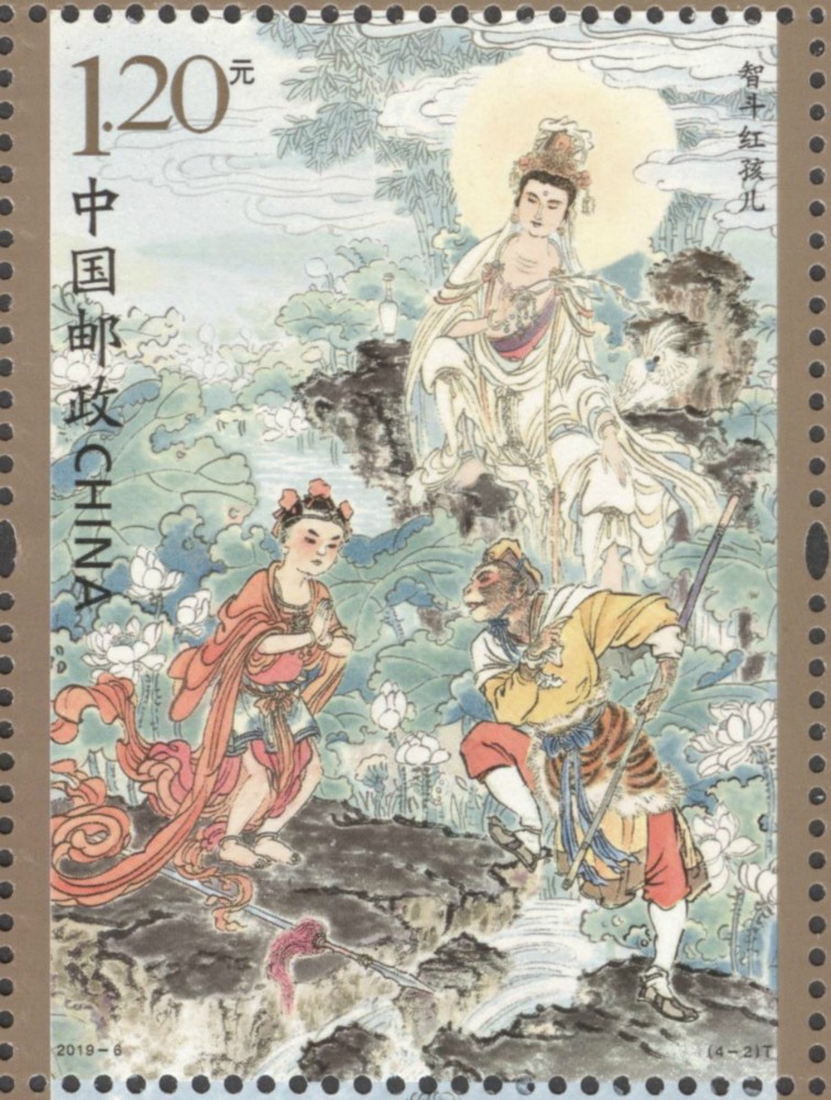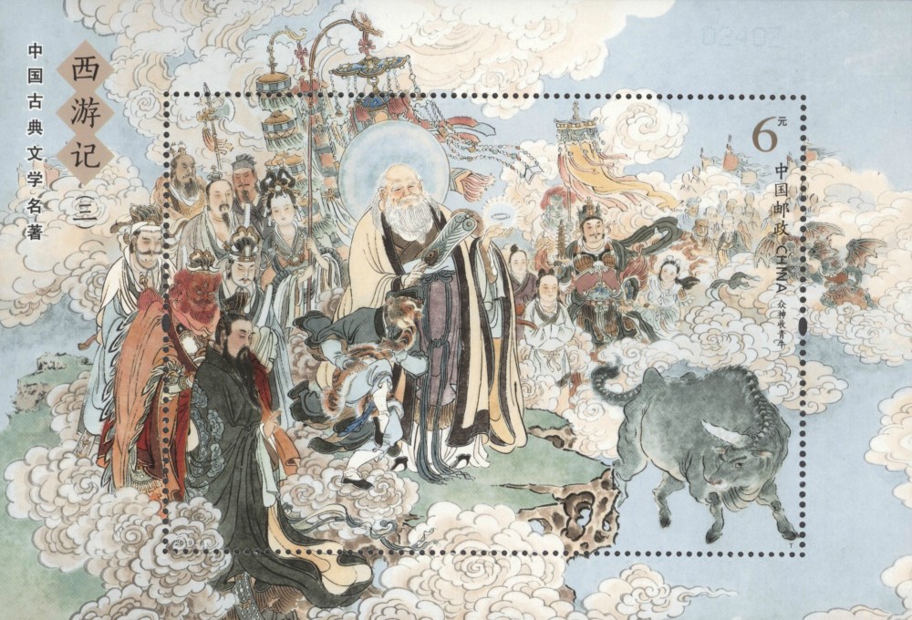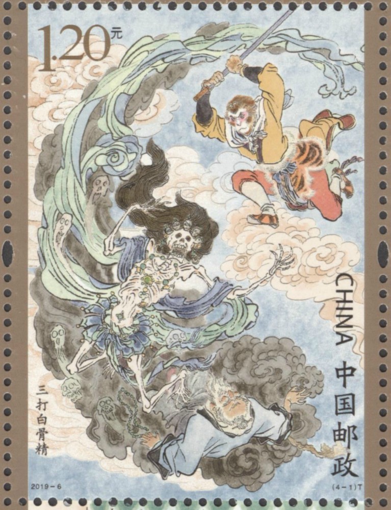 中国邮政定于2019年4月20日发行《中国古典文学名著——西游记(三)》特种邮票1套4枚,小型张1枚。邮票图案名称分别为:三打白骨精、智斗红孩儿、斗法车迟国、情阻女儿国,小型张图案名称为:众神收青牛。全套邮票面值为11.40元。