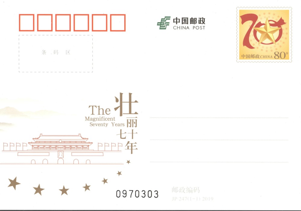 中国邮政定于2019年5月26日发行《壮丽七十年》纪念邮资明信片1套1枚。详情如下: