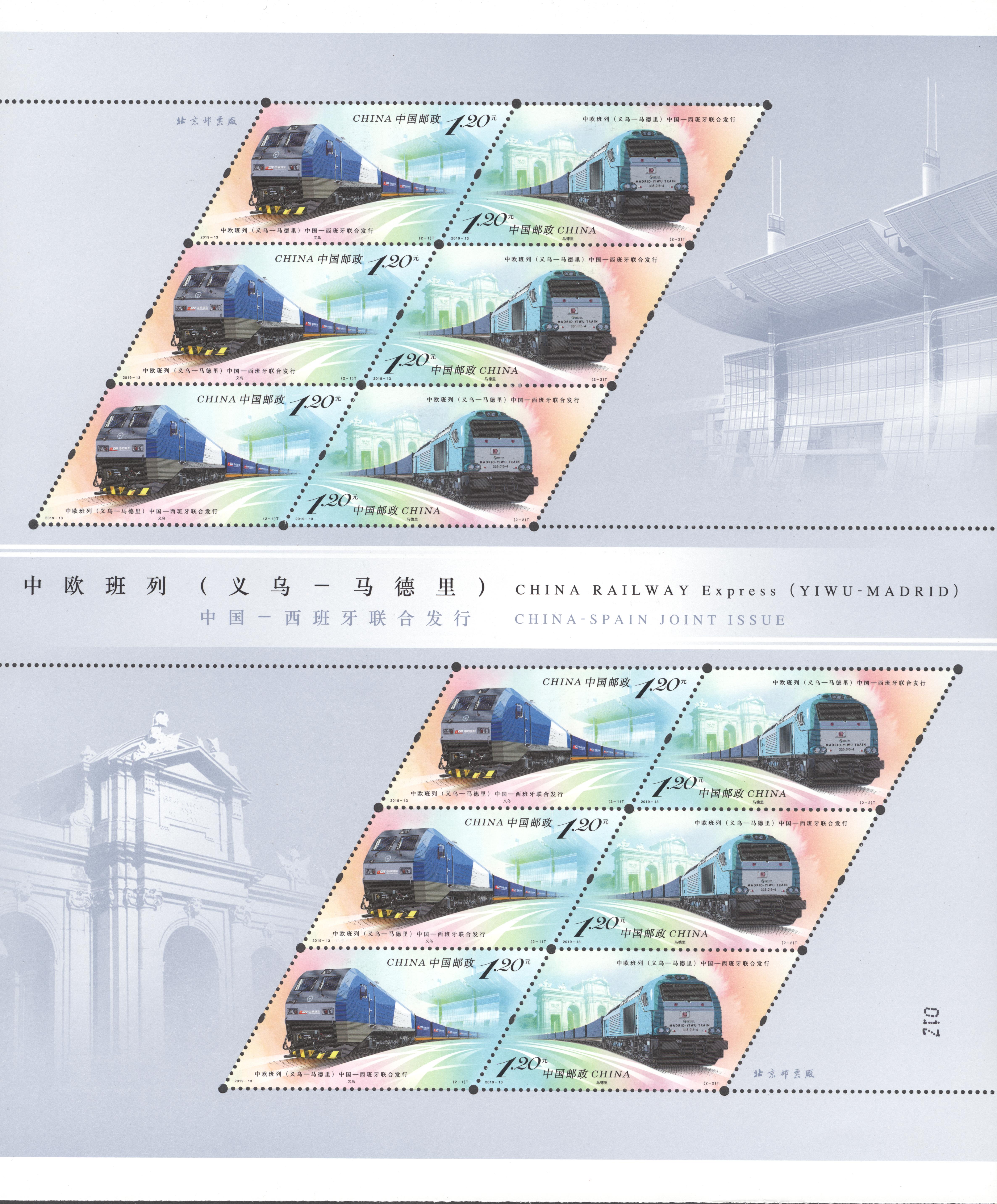 该套邮票为中国邮政与西班牙邮政联合发行。邮票根据画面内容采用了平行四边形规格,前景图案分别表现了从中国义乌和西班牙马德里出发的两列火车,背景图案分别为义乌小商品城和马德里代表性建筑——阿尔卡拉门。画面下方白色的铁轨组成了经纬线的形状,寓意中欧班列跨越千山万水将两国紧紧相连。