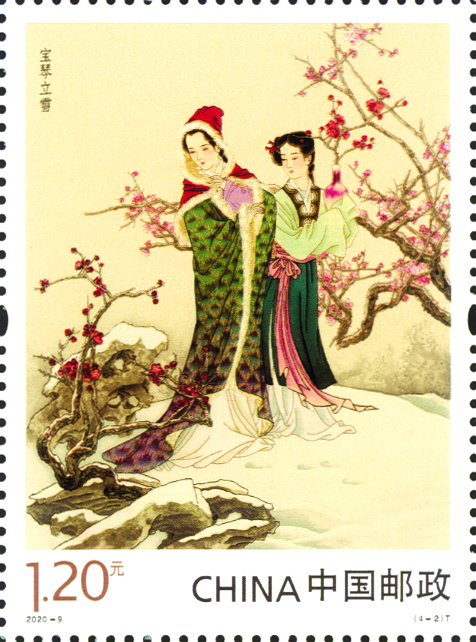 中国邮政定于2020年5月17日发行《中国古典文学名著——<红楼梦>(四)》特种邮票一套4枚,小型张1枚。邮票图案名称分别为:鸳鸯抗婚、宝琴立雪、三姐还剑、惑馋抄园,小型张图案名称为:湘云眠芍。全套邮票面值为11.10元。