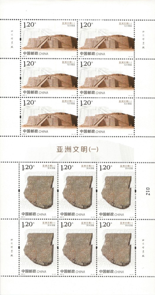 中国邮政定于2020年5月15日发行《亚洲文明(一)》特种邮票一套6枚。邮票图案名称分别为:乌尔塔庙、洪水泥板、哈拉帕印章、摩亨佐·达罗遗址、良渚玉琮、石峁遗址。全套邮票面值为7.20元。