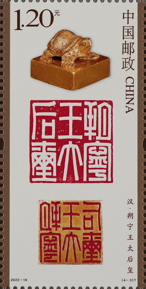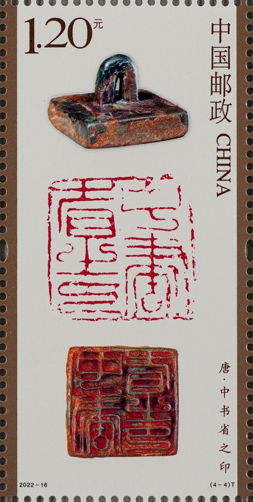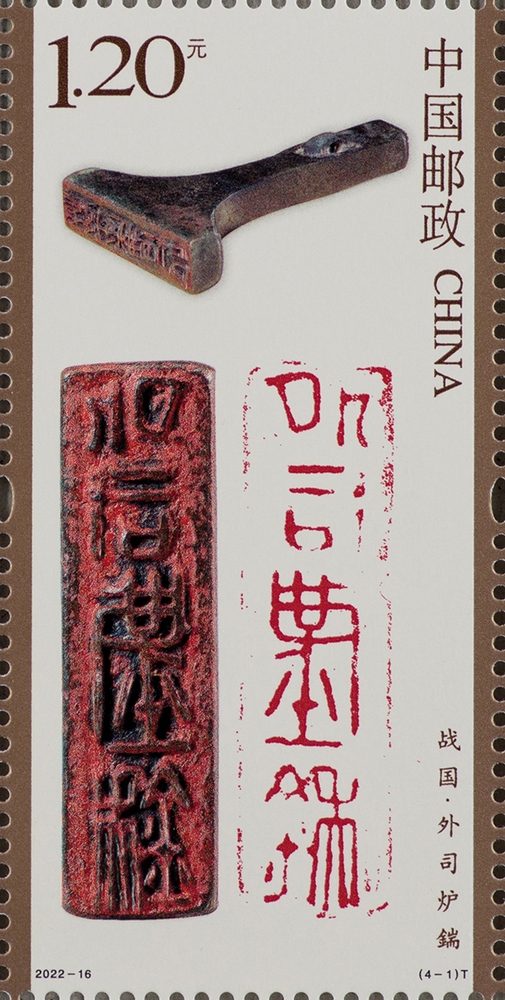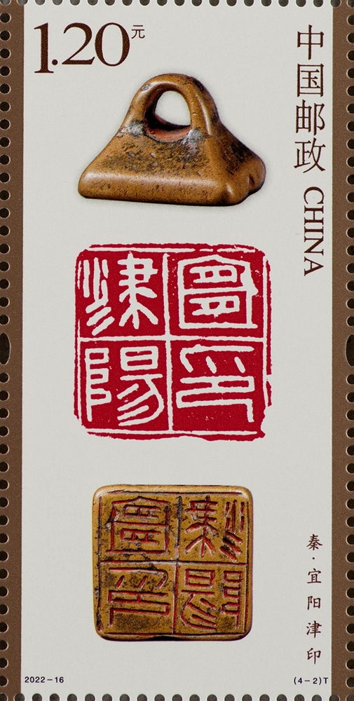 该套邮票由中国收藏家协会印章收藏与研究委员会会长、中国书法家协会理事、中国美术家协会理事、西泠印社理事容铁设计。邮票采用竖长票型,全方位展示了印章、印蜕、印面三部分,并采用古朴淡雅的宣纸色为背景,视觉层次立体,画面细节丰富,突出了中国篆刻艺术悠远浓厚的文化韵味。邮票第一图展现的“战国·外司炉鍴”,铜印,通高9.5厘米,为战国时期燕国官印,有观点认为是掌管铸造钱币的职官之官印,藏于北京故宫博物院;第二图展现的“秦·宜阳津印”,铜印,印面纵横各2.3厘米,是秦代管理宜阳县渡口官员的官印,藏于上海博物馆;第三图展现的“汉·朔宁王太后玺”,金印,边长2.4厘米,高2厘米,为西汉末年反对王莽的义军首领之一朔宁王为其母亲镌刻,藏于重庆中国三峡博物馆;第四图展现的“唐·中书省之印”,铜印,印面5.7×5.6厘米,通高3.9厘米,为唐代中央官署官印,藏于北京故宫博物院。