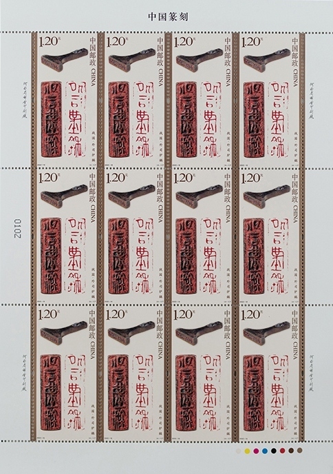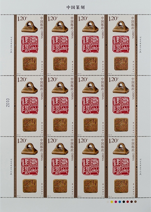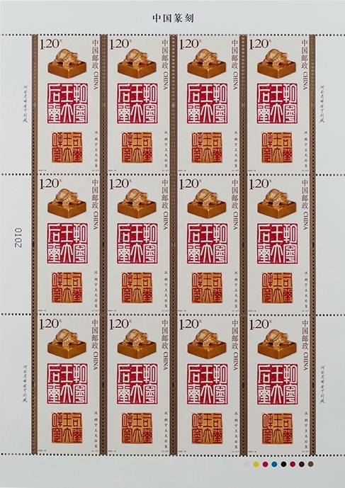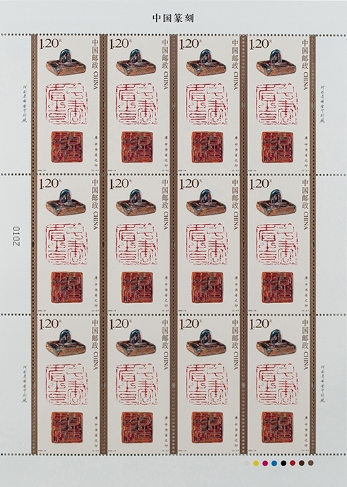 该套邮票由河南省邮电科技有限公司采用多色胶印工艺印制。邮票版式一特别增加三维浮雕击凸工艺,将印章立体化以突出篆刻艺术特点,实现了邮票印制工艺和篆刻艺术的完美结合。邮票版式二采用防伪手工宣纸,画面古朴典雅,在无声润物中传承中华文化,于方寸之间展现传统篆刻艺术瑰宝。