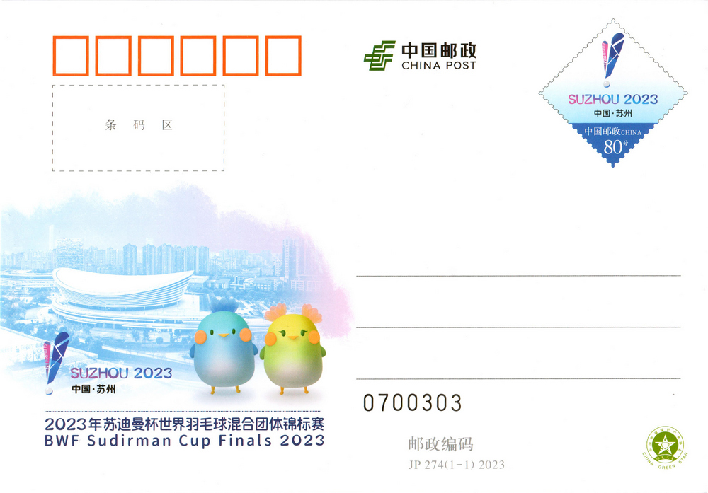 中国邮政定于2023年5月14日发行《2023年苏迪曼杯世界羽毛球混合团体锦标赛》纪念邮资明信片1套1枚。详情如下: