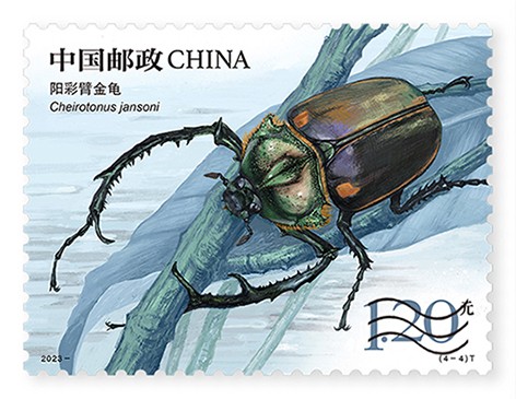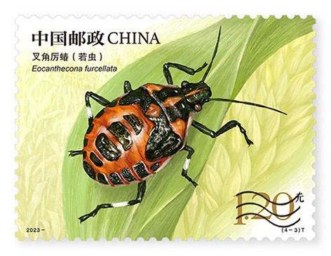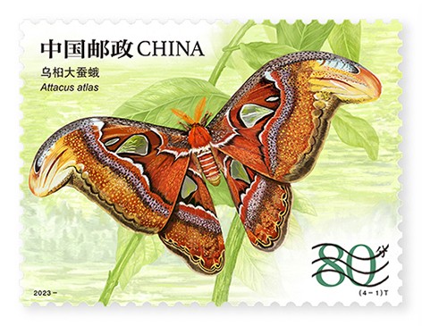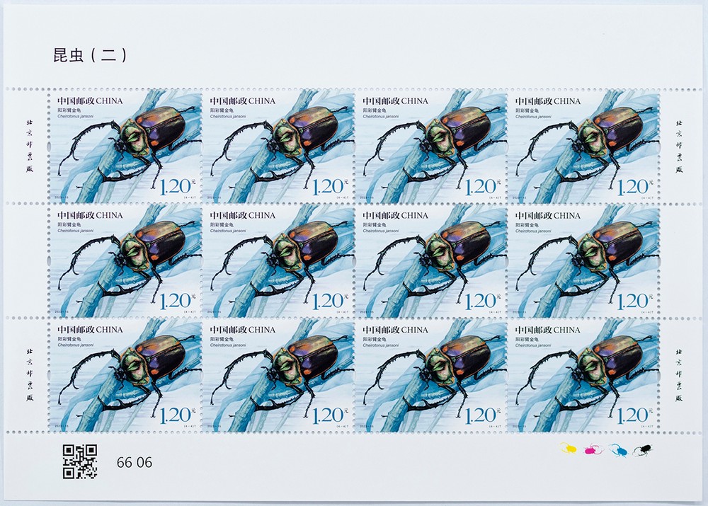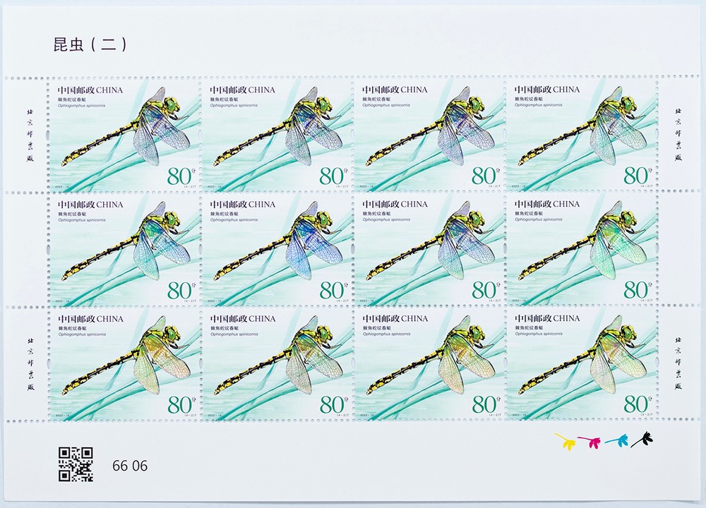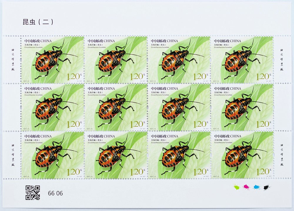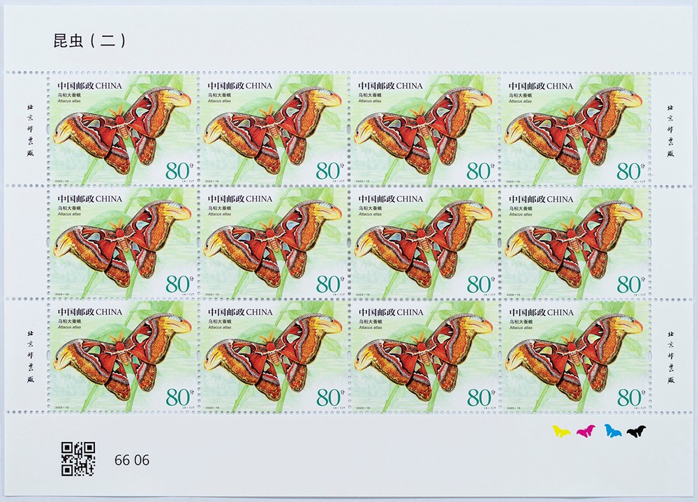 中国邮政定于2023年8月23日发行《昆虫(二)》特种邮票一套4枚,邮票图案名称为乌桕大蚕蛾、棘角蛇纹春蜓、叉角厉蝽(若虫)、阳彩臂金龟。全套邮票面值4.00元。邮票计划发行数量为685万套。
