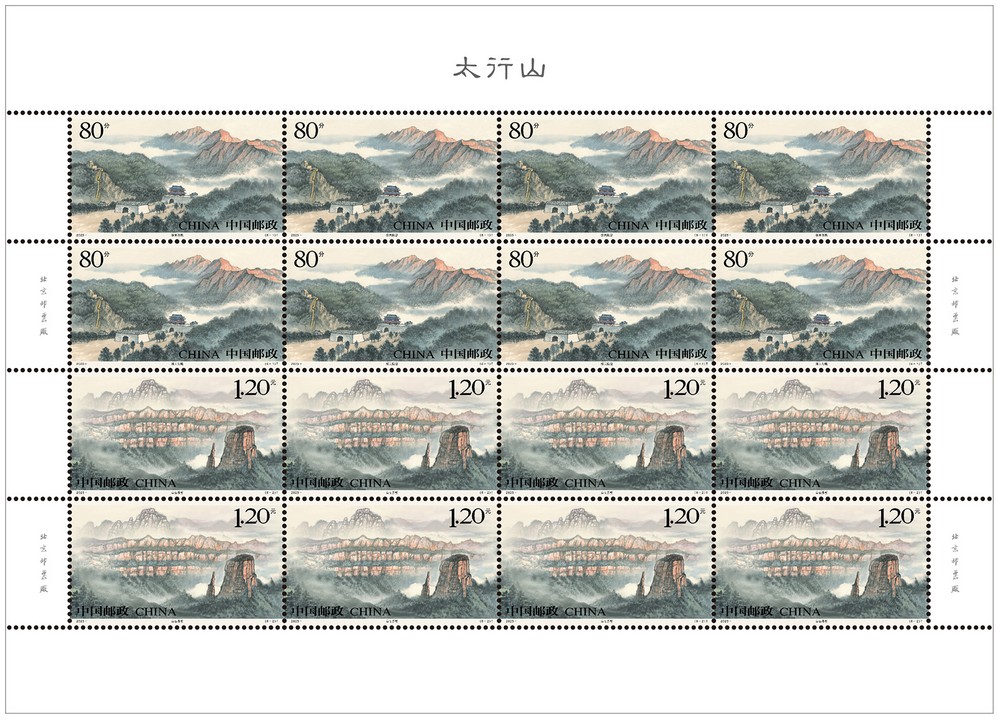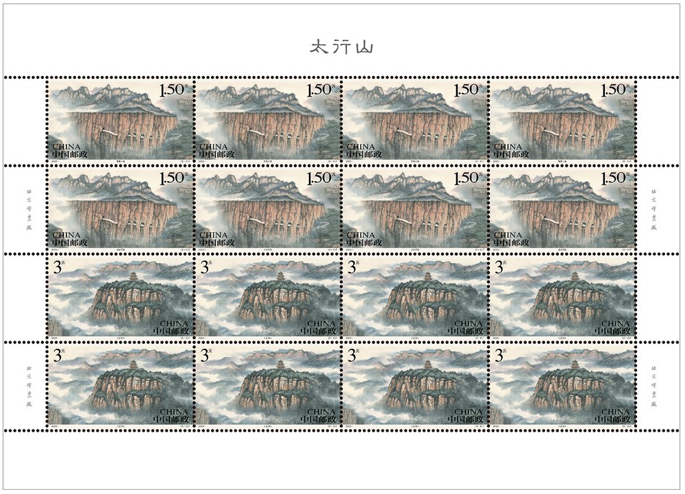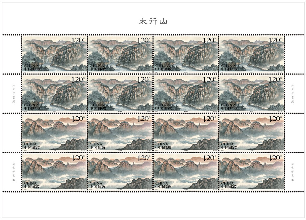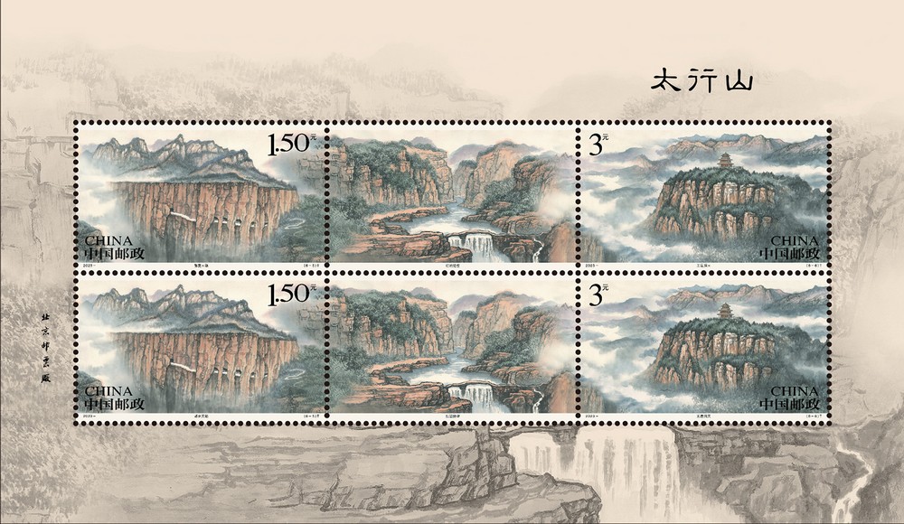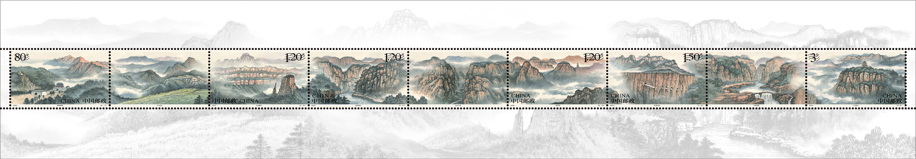 中国邮政定于2023年9月3日发行《太行山》特种邮票一套6枚,邮票图案名称为雄关险踞、白石赤壁、壶关幽谷、王莽奇峰、郭亮天路和王屋洞天。全套邮票面值8.90元。邮票计划发行数量为套票671.5万套、版式二83.5万版。